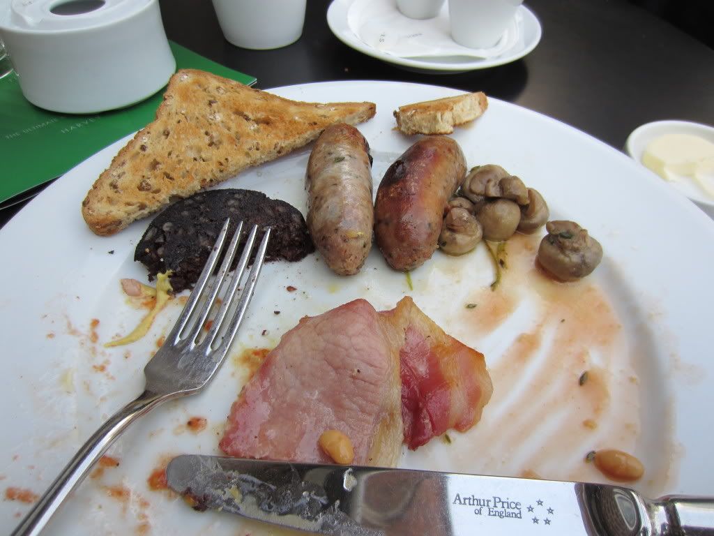 I had the traditional full English Breakfast - fried egg, bacon, mushrooms, Cumberland sausages, blood sausage, English baked beans, grilled tomato, and toast.